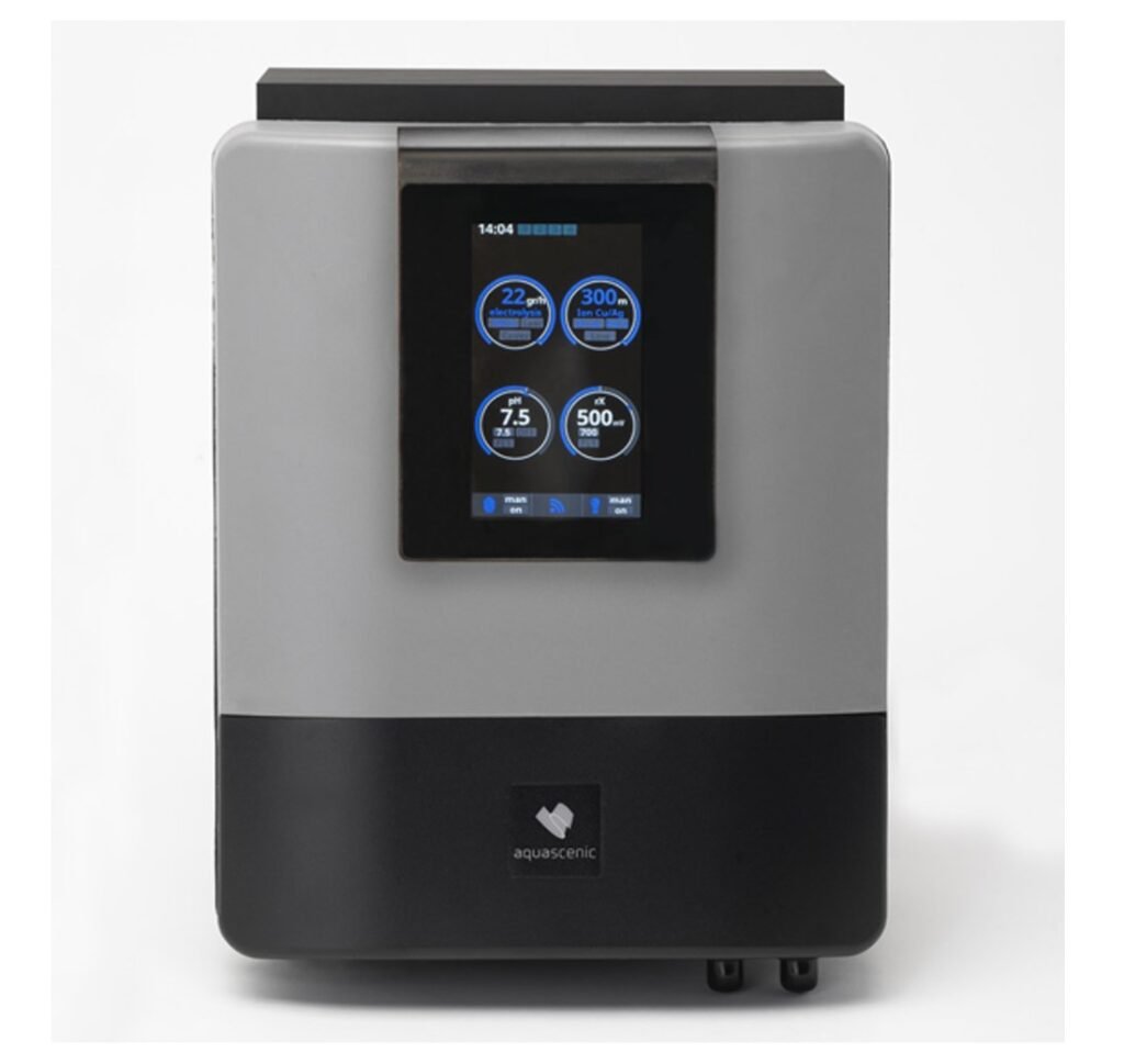 AQUASCENIC emplea tres métodos de desinfección para una perfecta esterilización del agua: hidrólisis, que rompe la molécula del agua generando agentes de desinfección a base de oxígeno (O3, O2, OH…) La electrólisis usa los cloruros presentes en el agua para producir HCLO (desinfectante) Además utiliza la ionización de cobre (algicida, bactericida y floculante) para generar un desinfectante residual en la piscina.